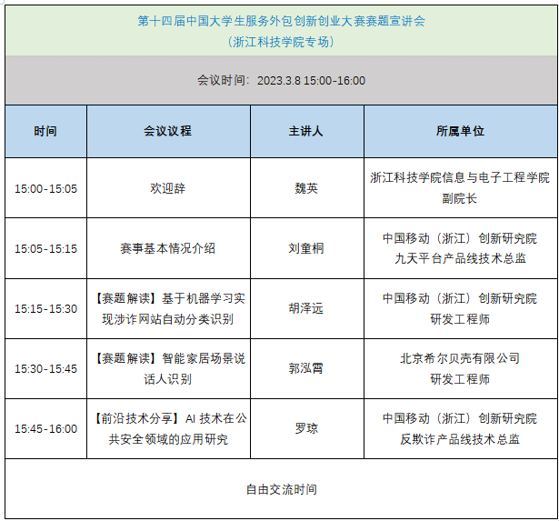 定于2023年3月8日下午3点在C1-A108举行第十四届中国大学生服务外包创新创业大赛赛题宣讲会,邀请中国移动(浙江)创新研究院资深专家解读赛题,分享前沿技术。