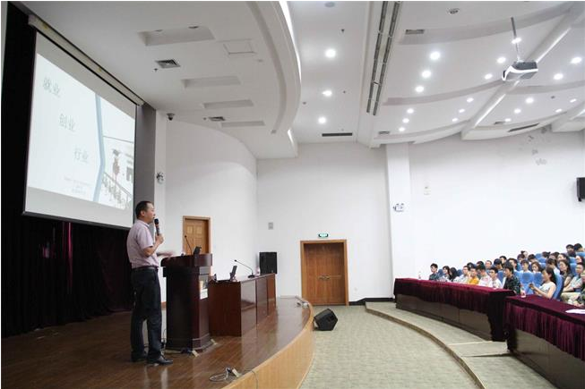 讲座开始之前,蔡学长亲切地问候了大家,表达了对母校学生的热切期望。他先从自身出发讲述了离校11年来在社会上打拼的经历,其中有盲目的找寻,也有拼命的创业,有失败,更有成功,他骄傲地在台上为母校学生和曾经的老师展示他所取得的辉煌,随后,蔡学长分“前言”、“行业”、“公司”等多个篇章,以自己在计算机行业多年摸爬滚打的经验为大家细细讲解了计算机行业的分类、毕业后的选择、应聘和创业的注意点等等,现场学生受益匪浅,在讲座最后的提问环节,面对学弟学妹们千奇百怪的问题,这个老男孩时而自信满满,时而略显狼狈。现场气氛融洽,讲座最终在欢声笑语中落下帷幕。