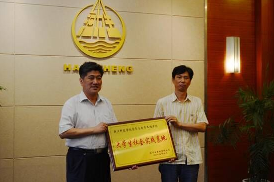 实践队成员参观了浙江海力生集团有限公司的生产车间,与海力生集团代表陈光生进行交谈,了解到如今企业与学校的新型关系:企业需要学校输送人才,学校需要企业提供平台,互利共赢,校企联合,共同谱写时代的新乐章。在交流的最后,信息与电子工程学院院长岑岗老师亲临现场为海力生集团授牌“浙江科技学院信息与电子工程学院大学生实践基地”,建立了密切的合作伙伴关系。从此,信息蔚蓝色的新鲜血液将在舟山企业的汪洋中奔淌。