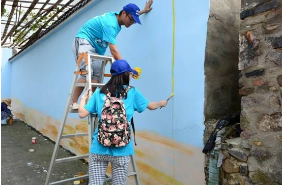 图为实践队成员为社区绘制壁画 为响应建设美丽乡村、美丽社区的号召,信息海·舟山蓝暑期社会实践队一行来到习主席访舟路程中的新型社区——南洞社区,开展了以“绿益光谷画述美丽海岛,蔚蓝信息携手最美乡村”的主题活动。在美丽的光谷,队员们与工作人员一起,帮助社区绘制带有本土特色记录当地居民风俗与往事的壁画,并分发了精心准备的调查问卷,围绕着“美丽海岛”展开了一系列调查。同时,实践队向居民们发出倡议,呼吁大家共同保护美丽舟山,从自己做起,从身边做起,为建设美丽海岛贡献属于自己的一份力量。居民们纷纷在签名墙上留下了自己的名字,团队成员也送上漫画柜