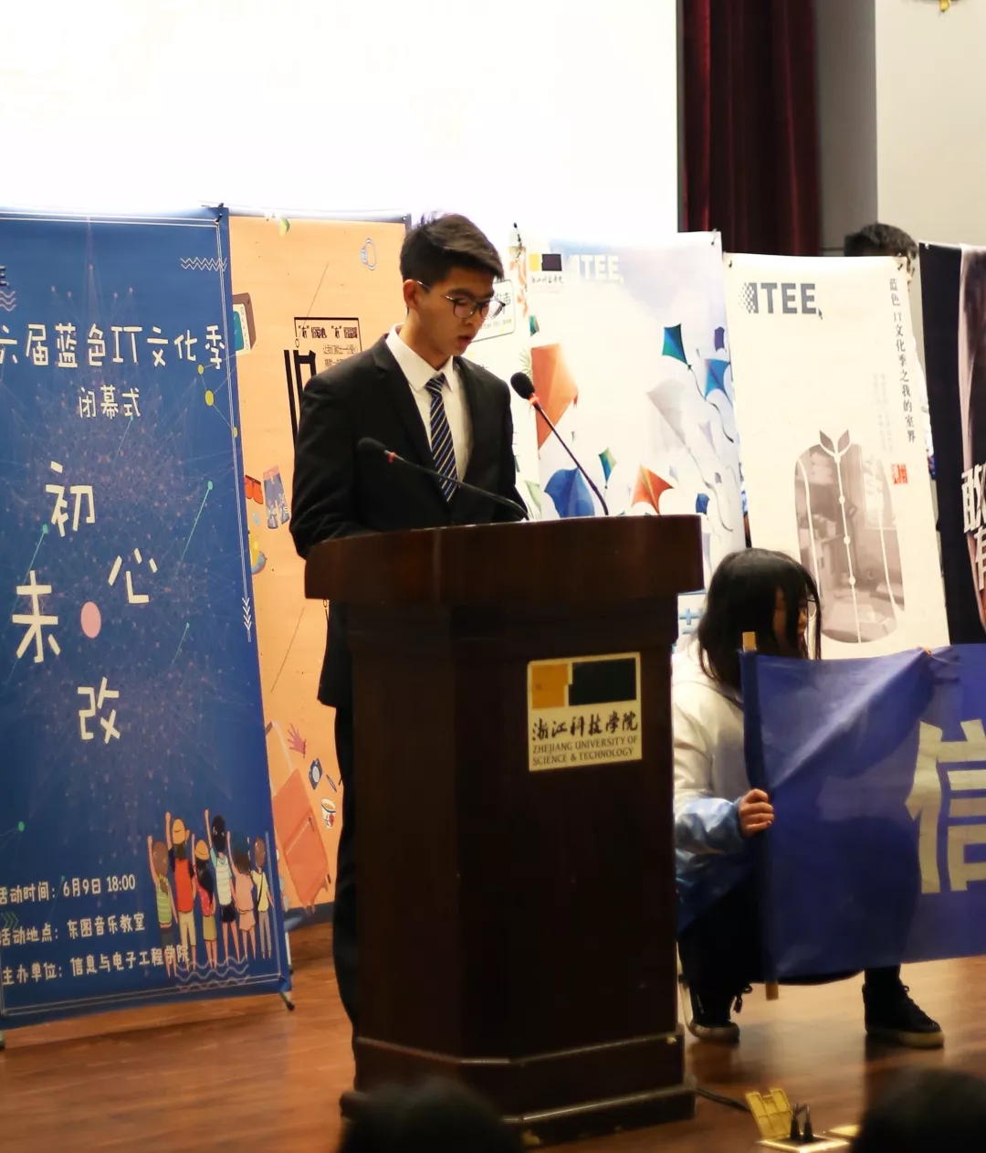 向其他学院表达了我们的念想——信息学子共助科院大学梦!这一口号将在之后融入学院各项工作中,共助我们的大学梦。在之后的答辩环节中,我们抽取到的题目是:学院学生会在本学院的文化建设上有哪些可取之处?在这里,不得不讲到我们学院的“蓝色IT文化季”,我们通过创意蓝、公益蓝、环保蓝、科技蓝、活力蓝等一系列“蓝色文化”活动,形成了我们漫画柜