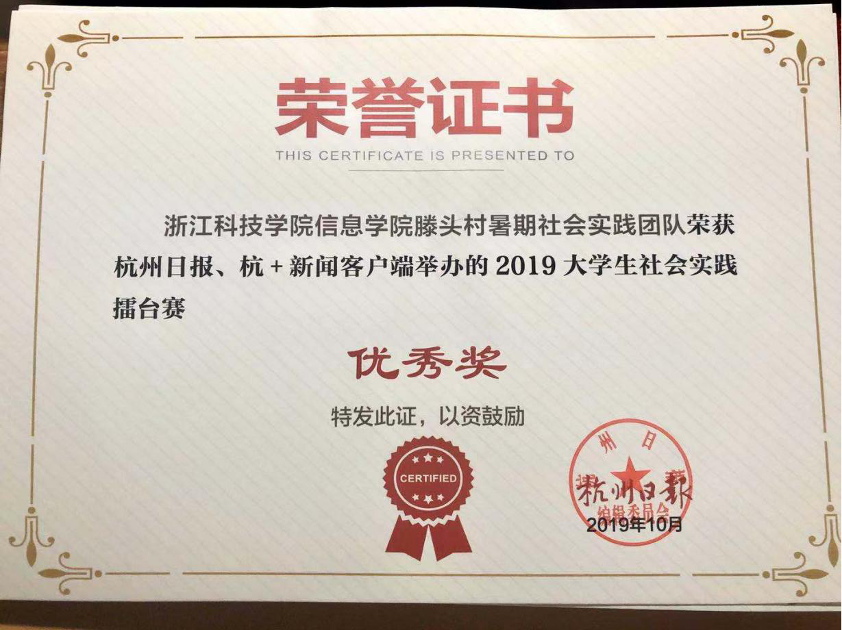 滕头村暑期社会实践团队于2019年8月参与了杭州日报举办的“2019大学生社会实践擂台赛”。2019年10月22日团队获得“2019大学生社会实践擂台赛优秀奖”,团队指导老师马利国获得“最佳指导老师奖”。