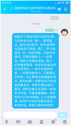 周武杰老师首先对研究生复试的流程做了解读,然后根据复试的每个环节给予了相应的建议。对于综合素质测试面试,周老师强调一定要准备充分,把时间用好,自己的个人成果也要梳理清楚经得起追问。对于外语听力和口语测试,周老师提醒同学们要抓住关键词,提早准备些常见问题的回答,要敢于表达。对于调剂系统,周老师强调一定要早填报,利用好名额,早做打算。马伟锋老师主要对复试的注意事项做了分享。嘱托学生一定要“形神兼备”。“形”强调要做好面试礼仪,材料准备齐全。“神”要有内容,有内涵,自己的项目和成果要有自己的思路和方法。联系导师注意要诚恳,材料要实事求是。最后两位老师还做了线上互动。同学们纷纷表示,收获很大。
