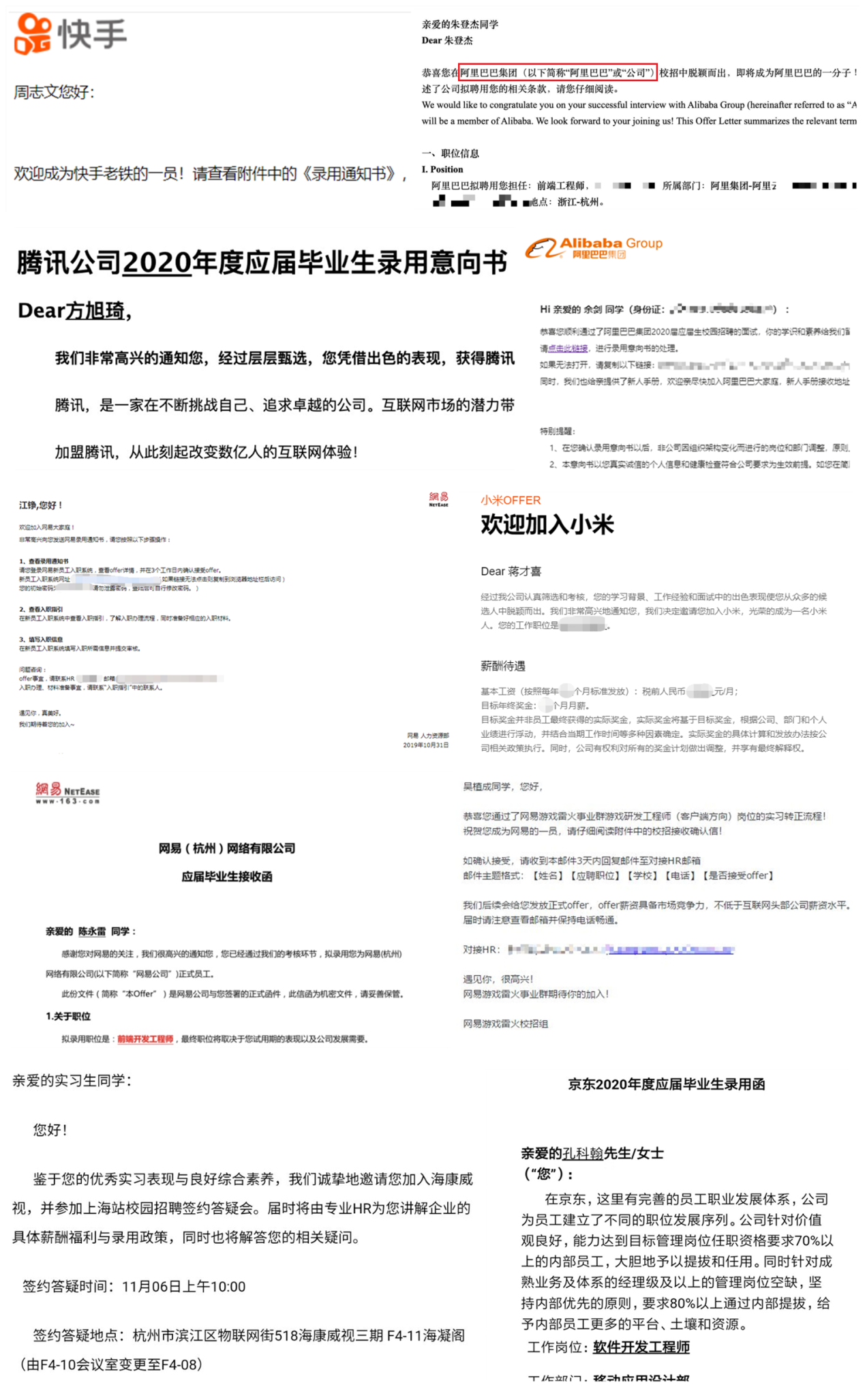 2020届累计近20名毕业生已经收到阿里、腾讯、网易、海康、京东、小米、快手、联通、大华、中控等一线互联网公司的offer并入职。