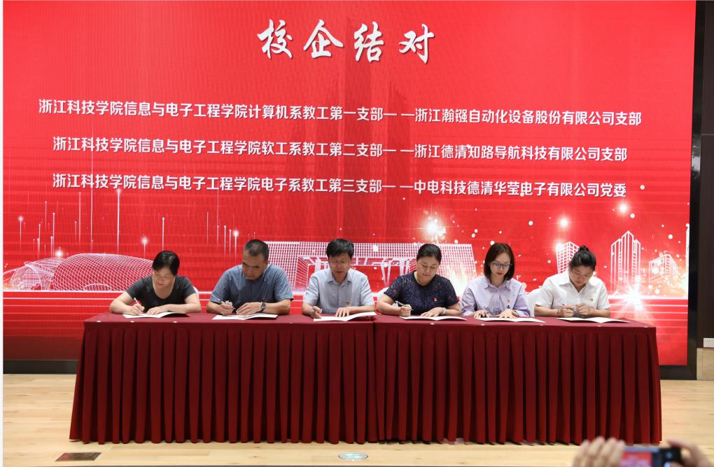 党委书记张蕾,高新区党工委委员沈亦红共同为“双科技”联盟揭牌,学院三个教工支部分别与浙江瀚镪自动化设备股份有限公司支部、浙江德清知路导航科技有限公司支部和中电科技德清华莹电子有限公司党委进行校企结对。