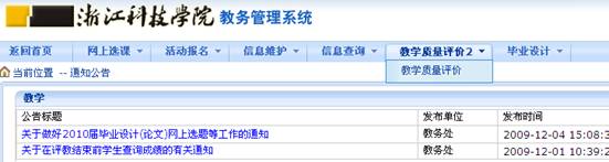 2、登陆系统后,选择菜单“教学质量评价2—>教学质量评价”,如图所示: